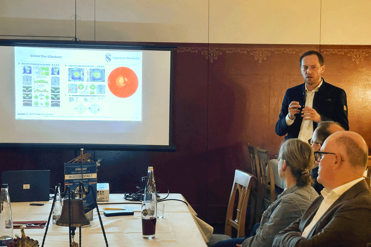 Diesen Monat referierte Dr. med. Christian Enders von der Praxis "Augenärzte Werdenfels" zur Augenheilkunde und ging auf die häufigsten altersbedingten Augenkrankheiten ein. Insbesondere der "Graue Star" (Linsentrübung), "Grüne Star" (Erhöhung des Augeninnendrucks) und die altersbedingte Makuladegeneration (AMD; Netzhautabbau) nehmen ab 55-60 Jahren deutlich zu.